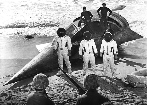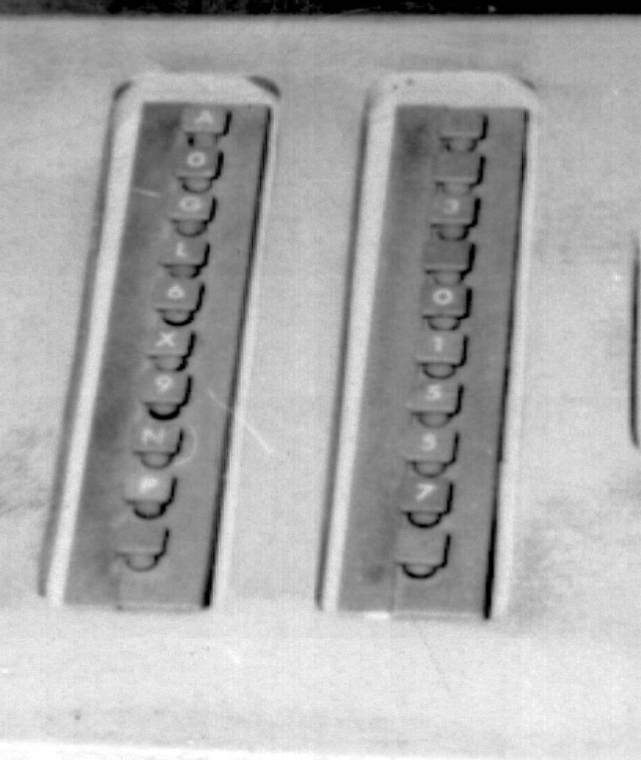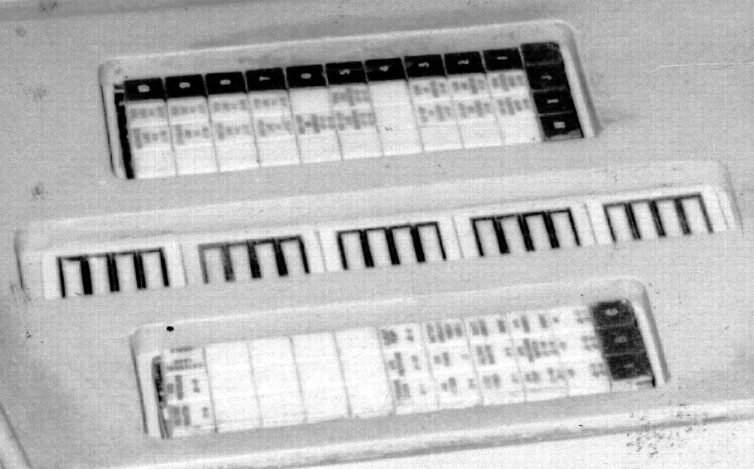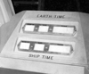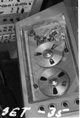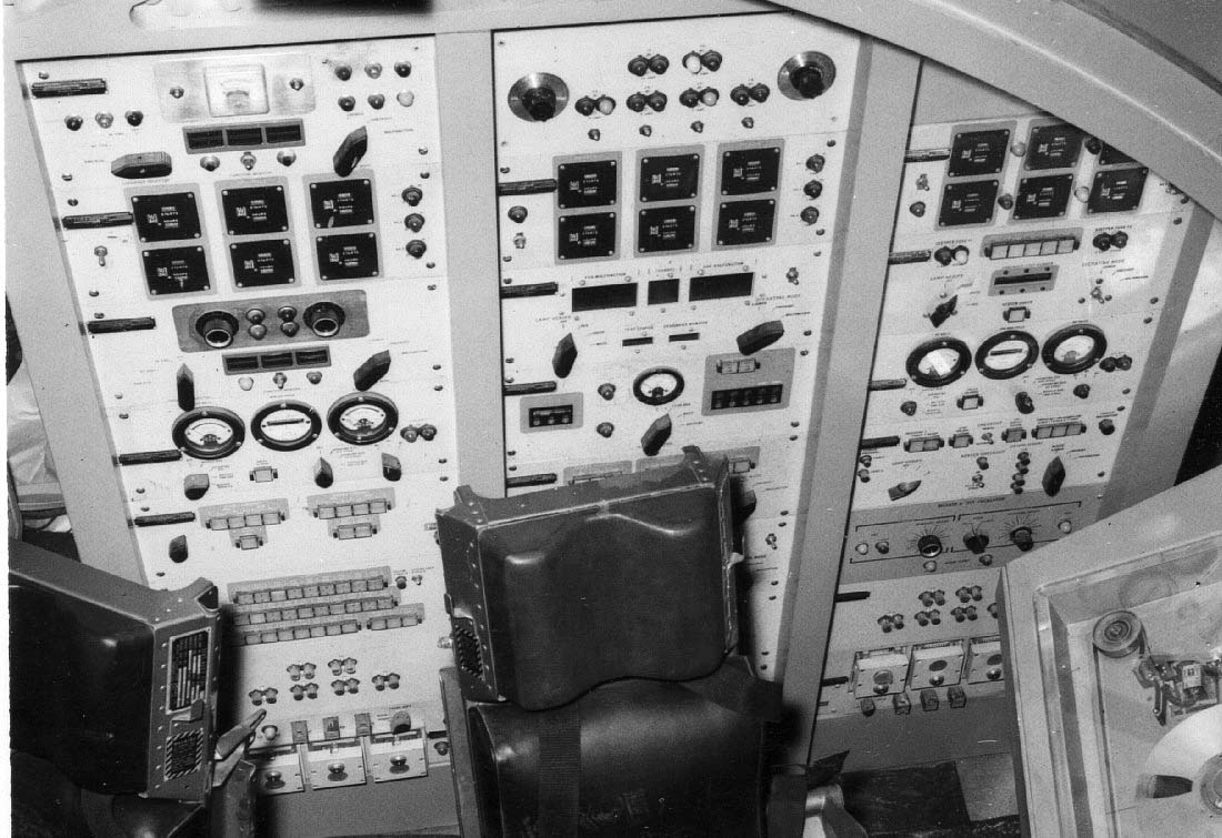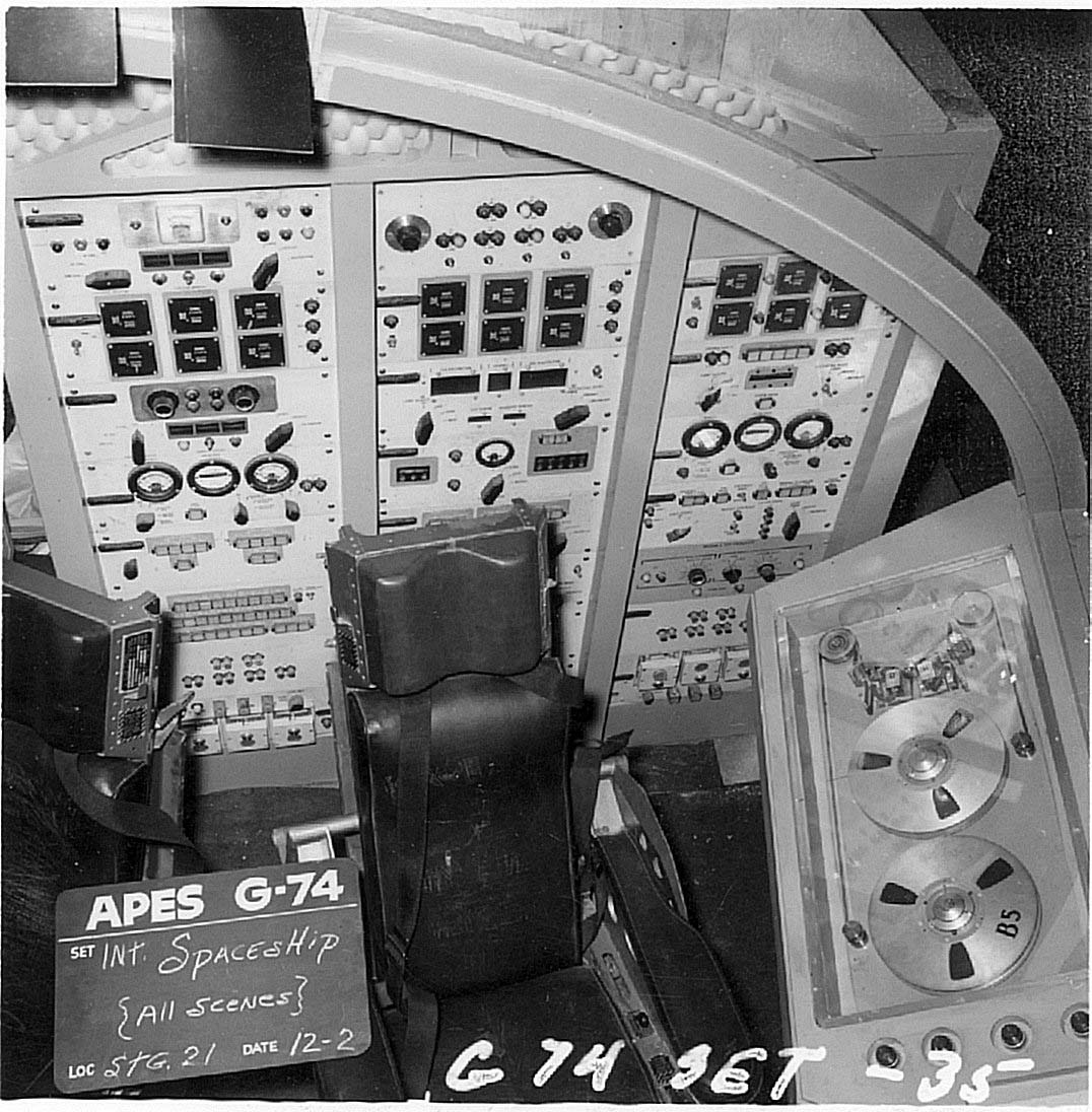 The instrument panels in this set are actually from a variety of surplus sources. The panel with the rows of square buttons with grey backgrounds are taken from a USAF Titan I missile site as are the event counters and a few of the others. The "tape drive" is actually a 16-track audio recorder. All these instruments featured heavily in the various Irwin Allen science fiction shows through the years and should be very familiar to most fans. The ejection seats appear to be taken from an F-105 Thunderchief or F-106 Delta Dagger fighter. /font>