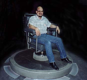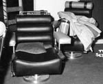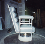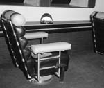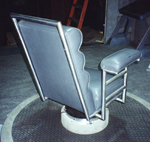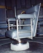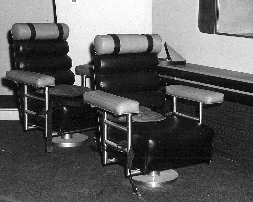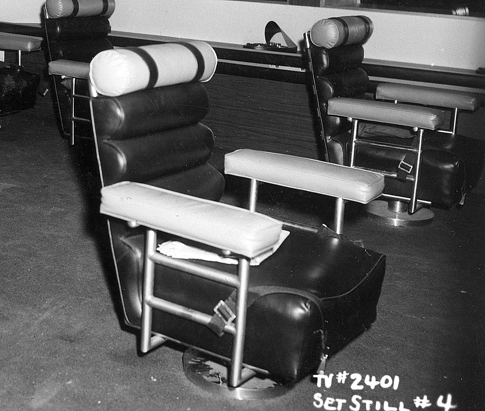 This is one of at least six seats built in this style at 20th Century Fox studios. Four were used on the interior spaceship set built for "Planet of the Apes" and six were used as passenger seats for the "Spindrift" in "Land of the Giants". In "Planet of the Apes" the upholstery was all black and in "Land of the Giants" it was black with a red headrest. The example at the top is missing its four-point harness, large round headrest pad and the upholstery has been painted grey. It was probably acquired from a prop rental house in Hollywood since Fox had sold off much of its property collection in the early '70s (in a series of three auctions run by Sotheby's).