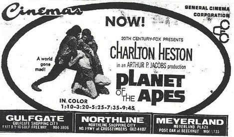 > dear james, that is such a cool story i felt that way the first time i saw planet in dec 1968 at the meyerland general cinema 1 . a loney tune cartoon came on then the coming attractions and then the wait was over with the fox fanfare cued up then the opening credits to planet how exciting it was great being a kid i was 12 at the time i remember seeing planet still gave me goosebums