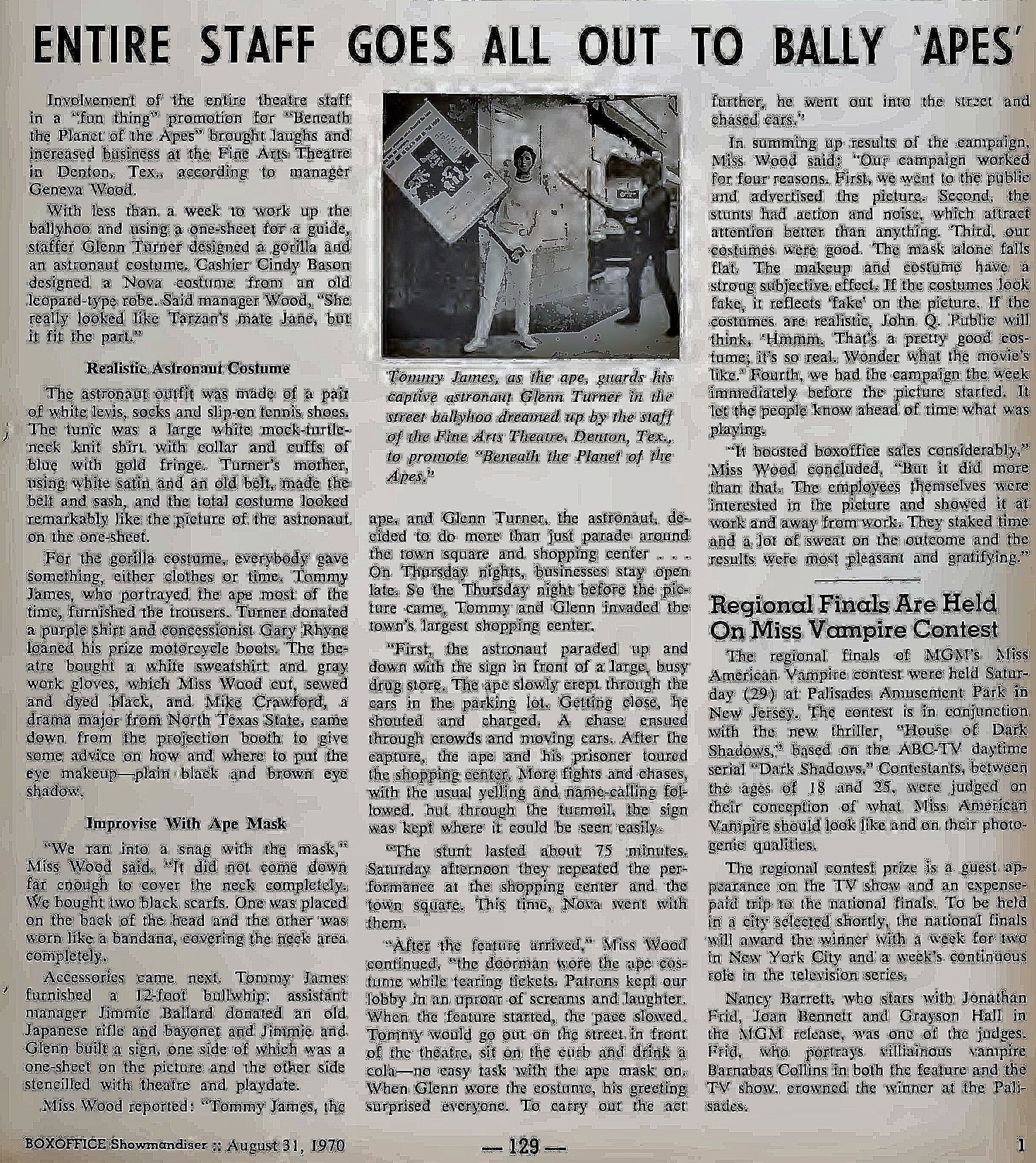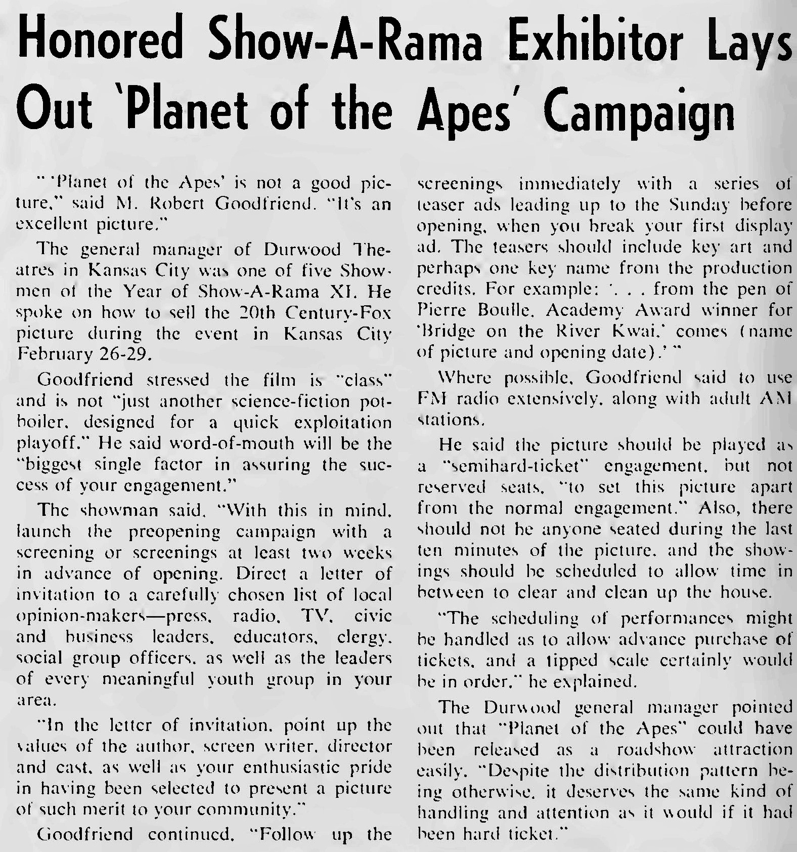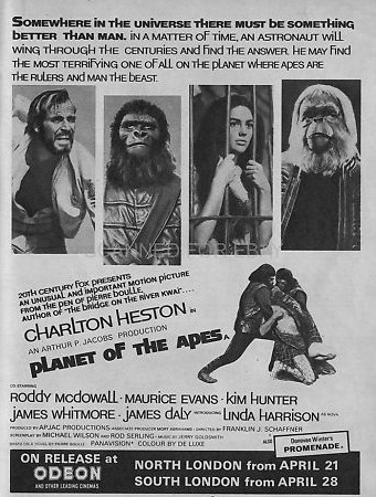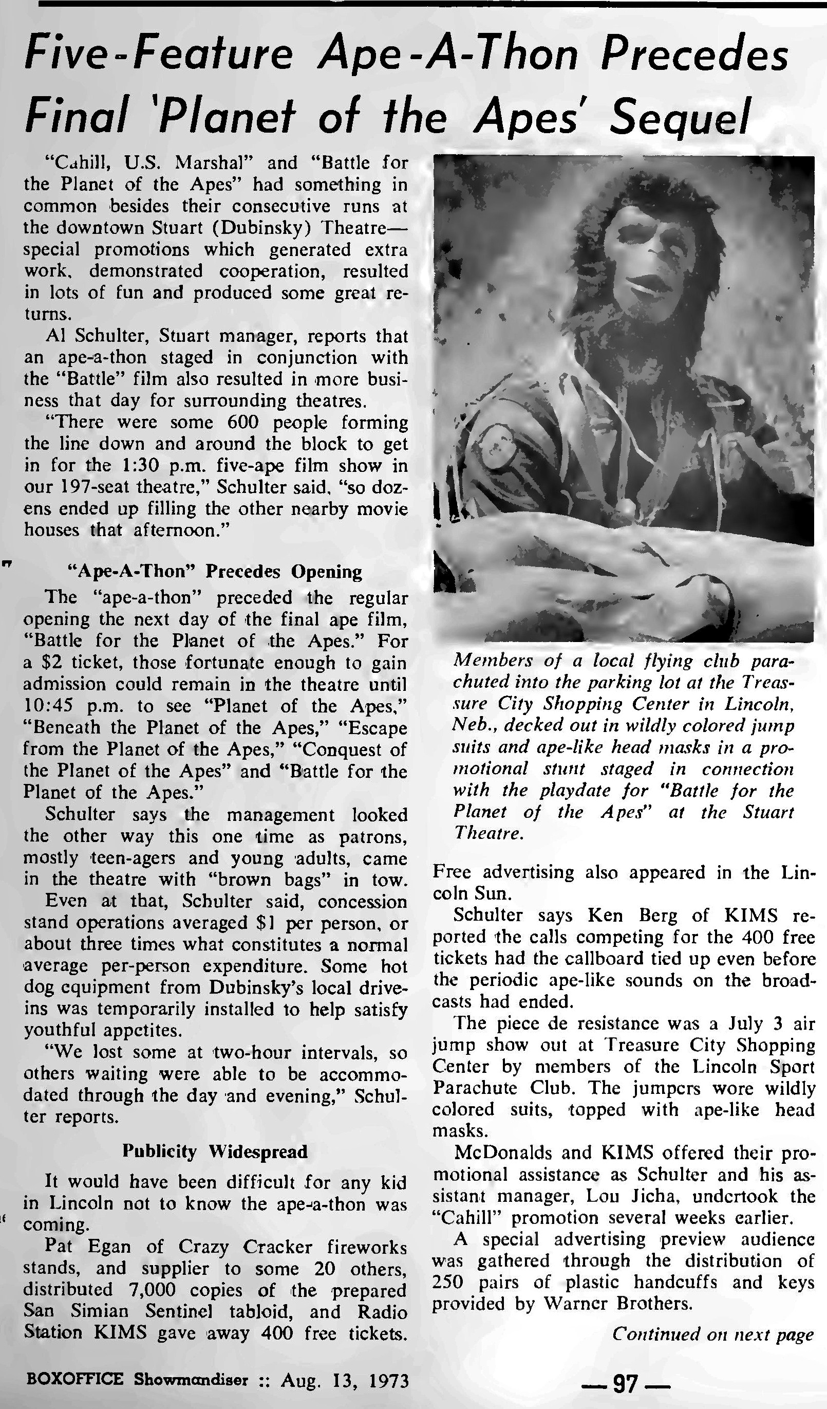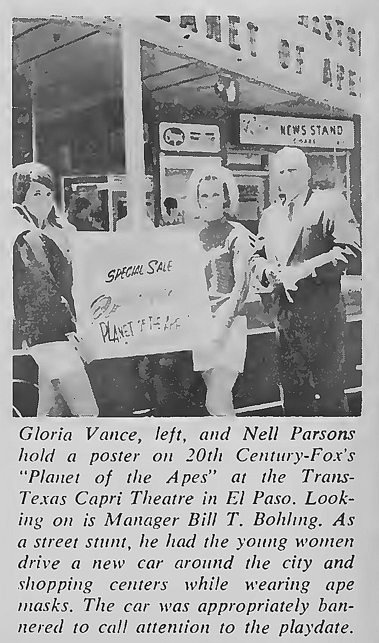 dear group, about mid july 1973 the oak villeage theatre played all five ape films in order. it was neat seeing them on the big screen . here is a few articles on the theatres opening from box office magazine . the first photo shows the marquee when it opened in 1963. enjoy from william burge |