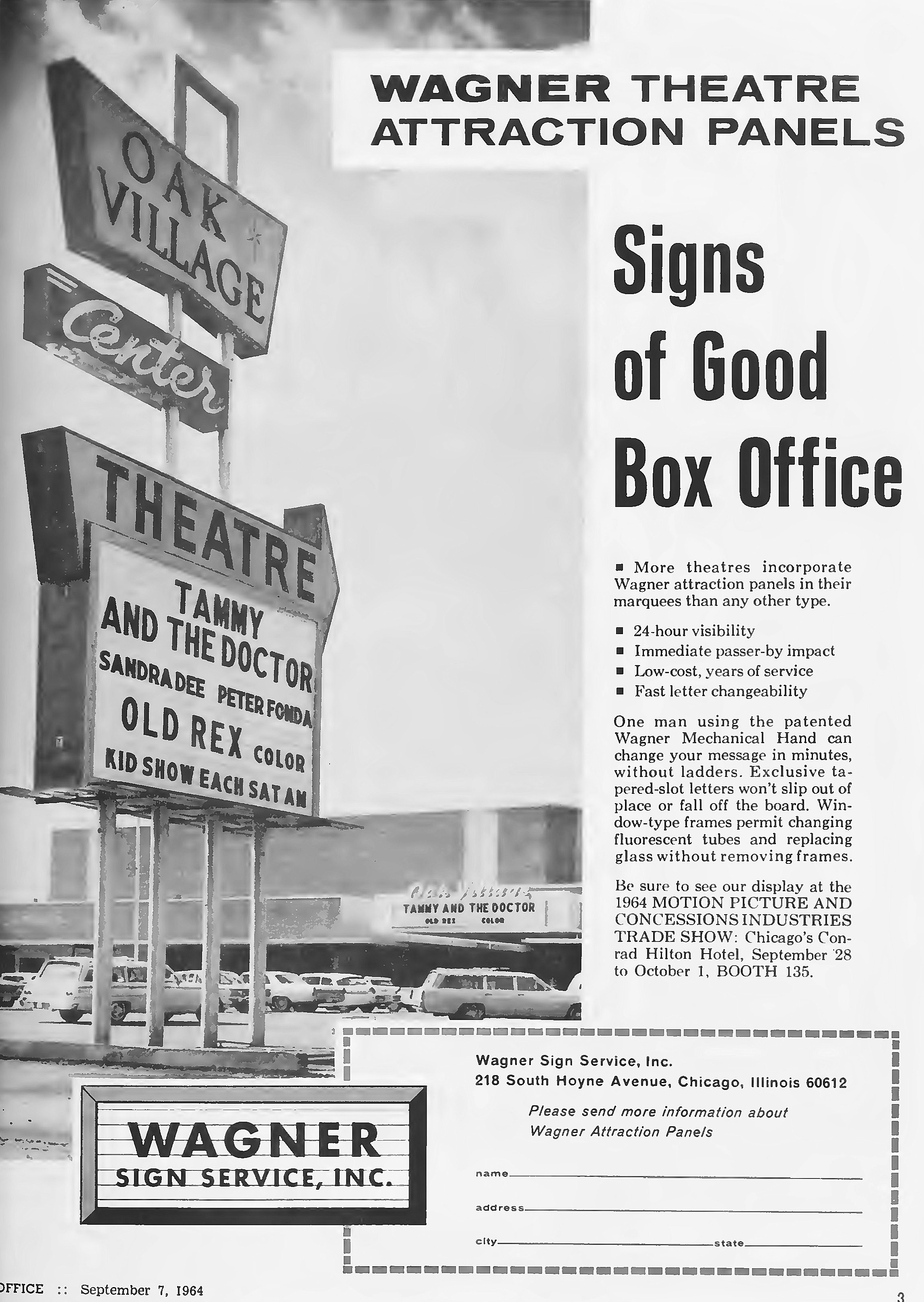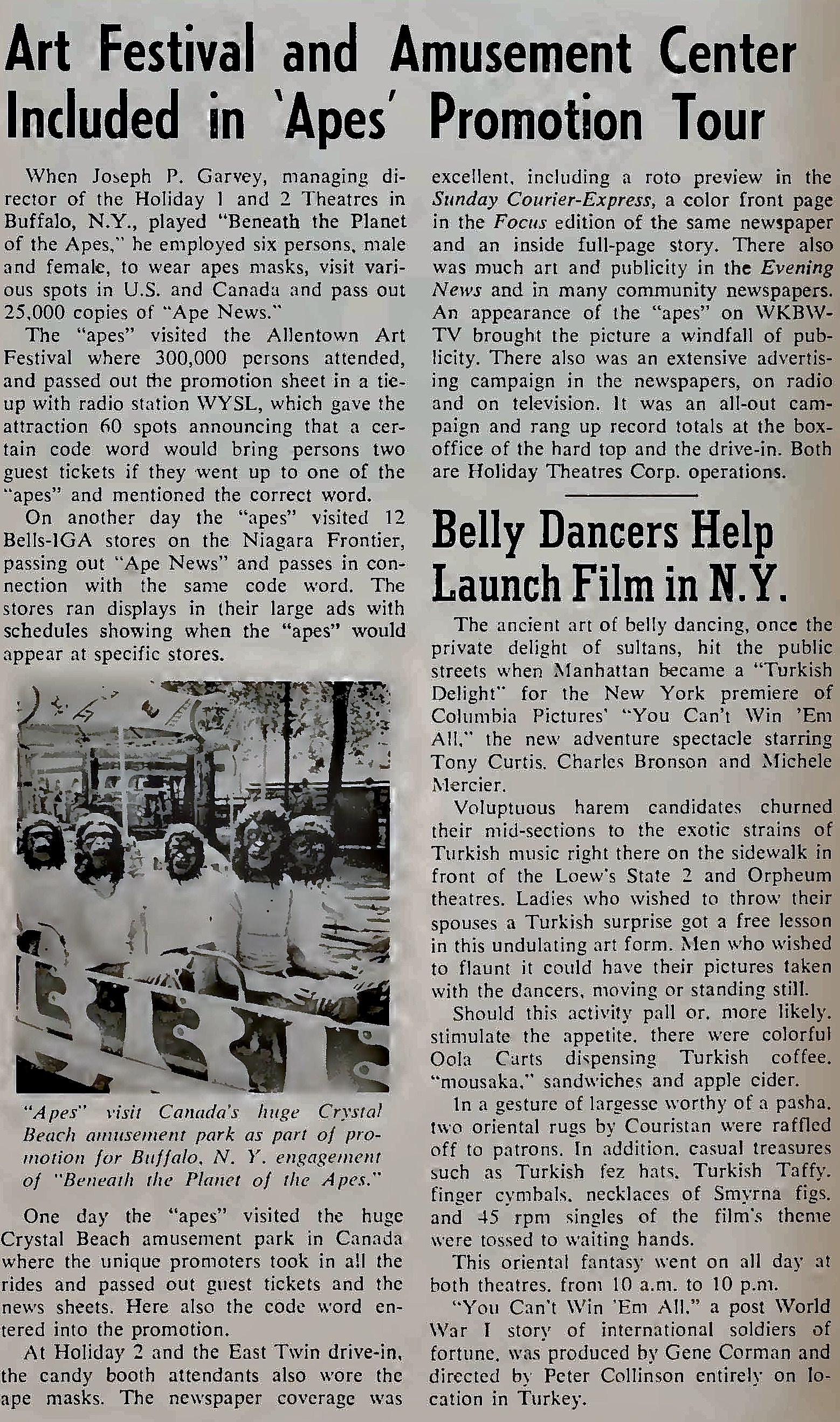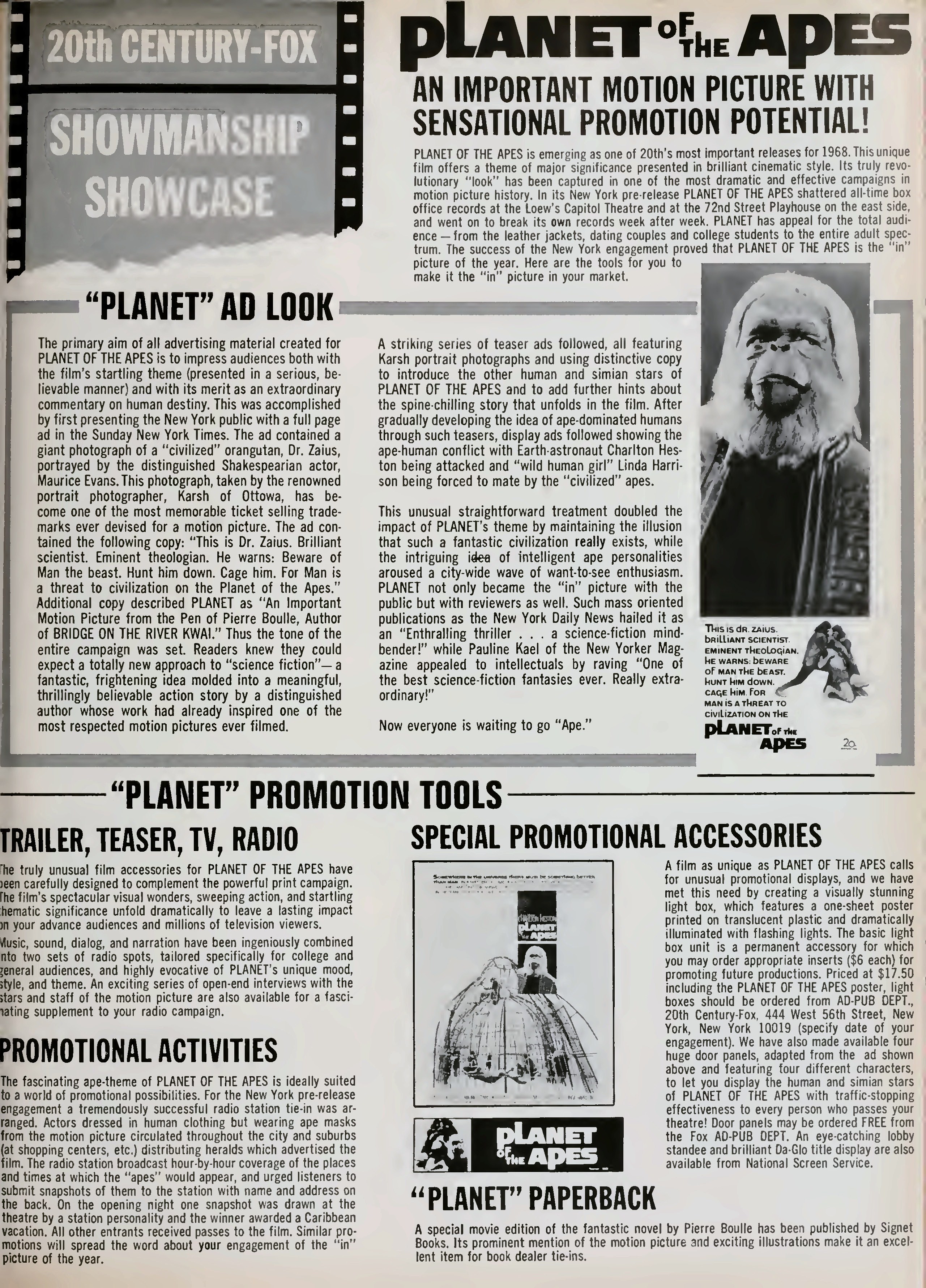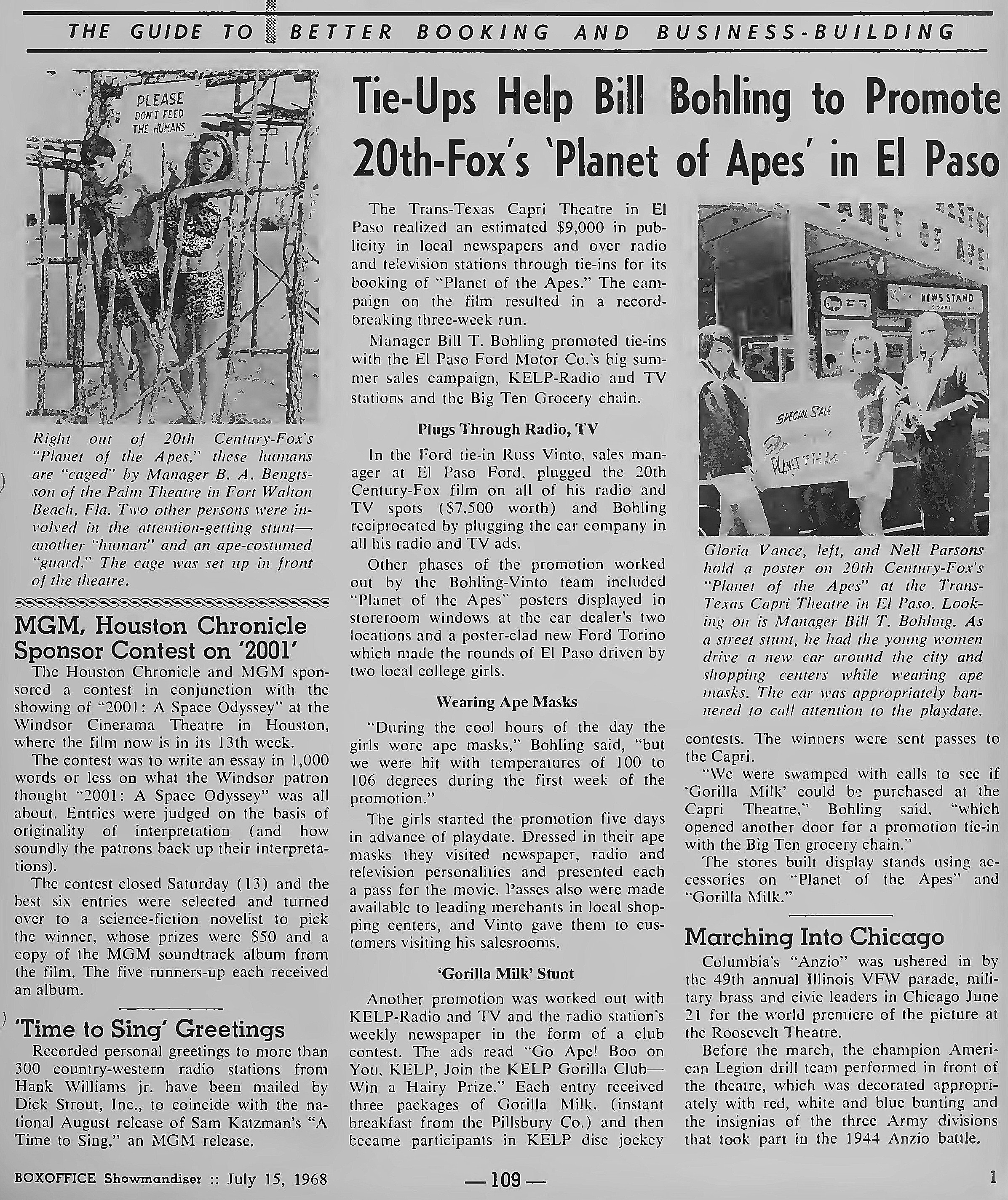 dear group, about mid july 1973 the oak villeage theatre played all five ape films in order. it was neat seeing them on the big screen . here is a few articles on the theatres opening from box office magazine . the first photo shows the marquee when it opened in 1963. enjoy from william burge |
