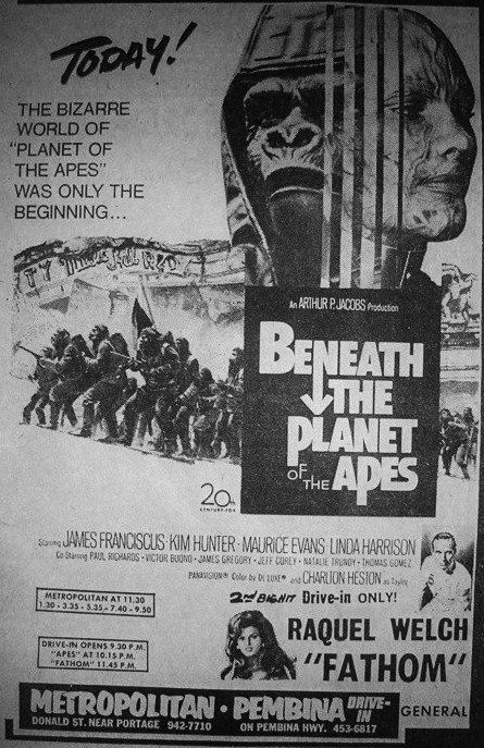 I'd known a sequel was in the works, but I knew nothing else. I came home from school (5th grade) one afternoon in late May 1970, and my younger brother had been home all day for some reason, and he told me he'd seen a commercial on TV for "Underneath the Planet of the Apes." I went nuts, of course, and spent the next day sitting in front of the TV for hours, and I'm not kidding, hours waiting for a 30 second commercial for this movie. I kept the channel on either 5 (WNEW) or 11 (WPIX) until that commercial showed up -- it was torture. When it finally did arrive it was the commercial where you first see the white arrow drop down and cut the screen in half. I was struck right away with how bizarre the movie looked, it wasn't at all what I thought the sequel would be -- the whole mutant thing seemed very strange.