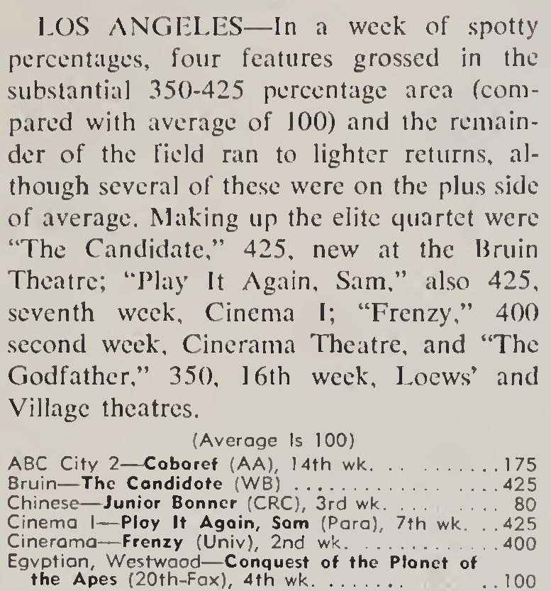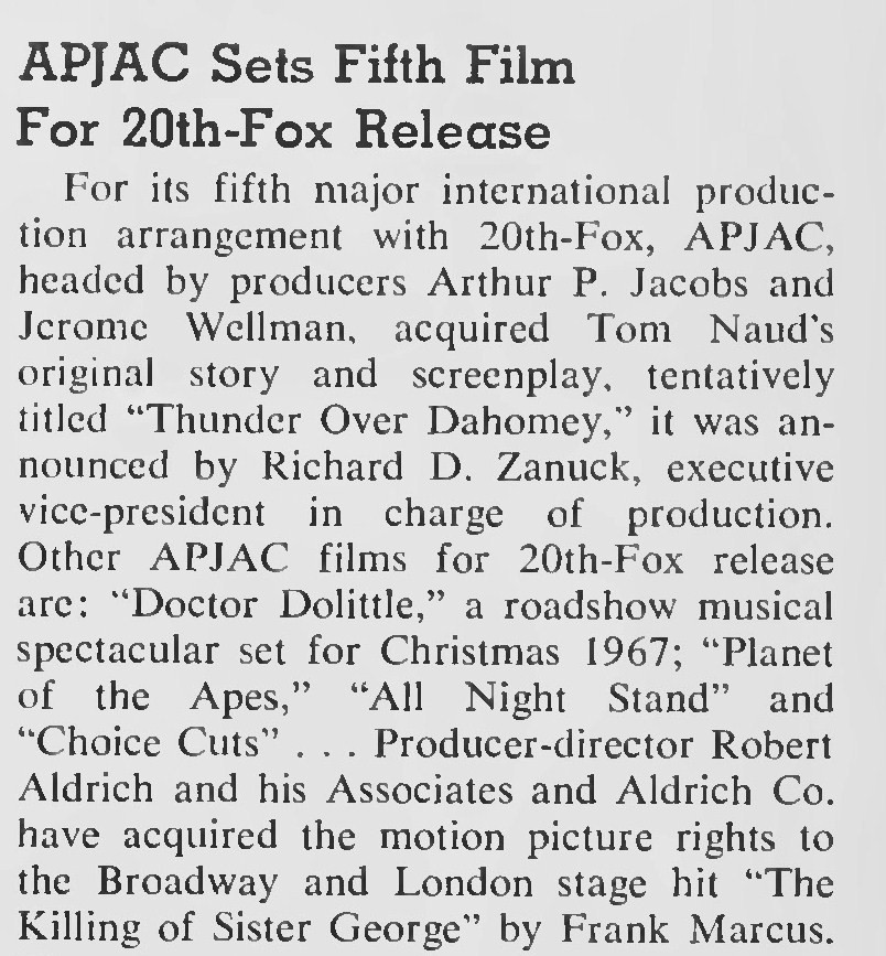 Before that film is shot, however, the fourth of the "Apes" movies will come along. There seems to be no end in sight for this hugely successful series. Jacobs thought the second one would be the last and the apes' planet blew up at the end of that one and everybody was killed. But the world wanted more, so Jacobs figured out a way to do the one in current release. The fourth will be relatively easy, and if you've seen "Escape From the POTA" you can pretty well figure out what "Conquest of the POTA" will be about. After that - "If that's the last", Jacobs says - there will be a TV show based on the Apes plot. He says they have been after him to do a series since the original film came out, but he won't do it until the feature films have run their course. He'll be happy meanwhile if anybody can tell him where to put that monkey in the underwater picture. He's losing sleep over it.