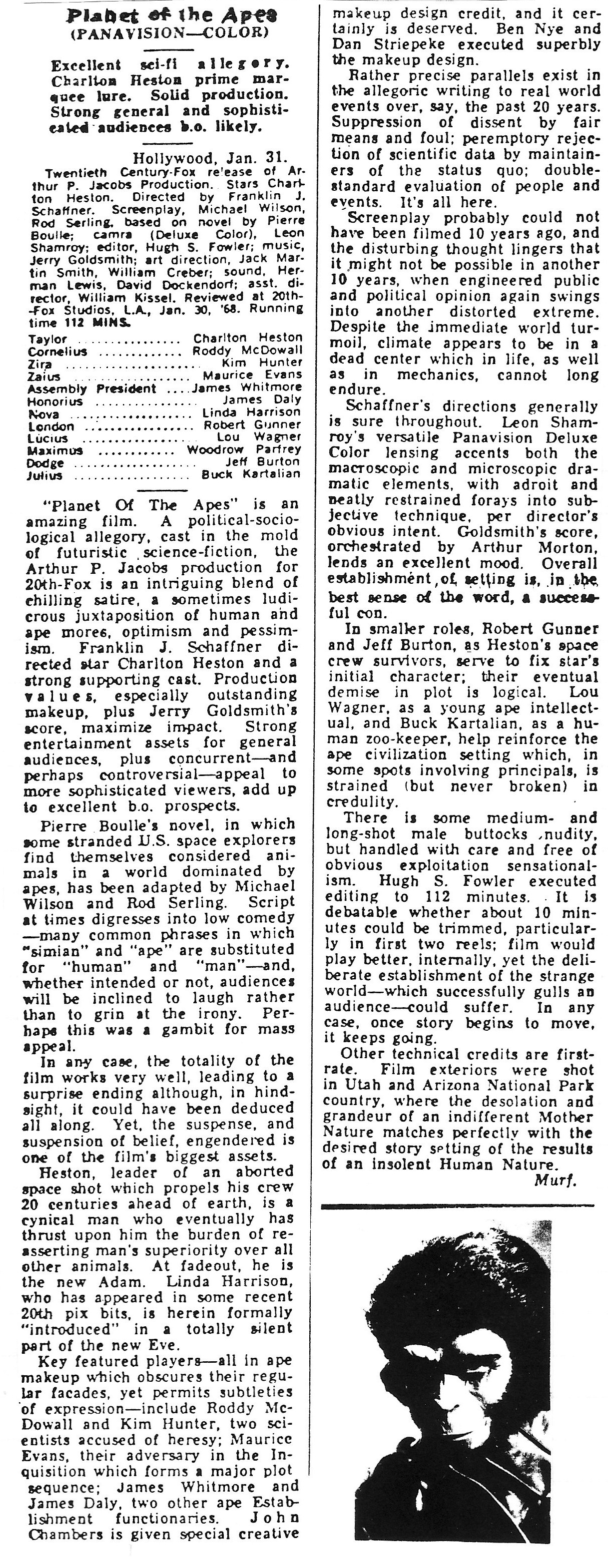 .html.html From: William Burge Sent: Friday, June 22, 2012 9:40 AM Subject: planet review 1-31-68 dear group, I found the original review in variety magazine dated jan 31, 1968 enjoy from william <.html <.html