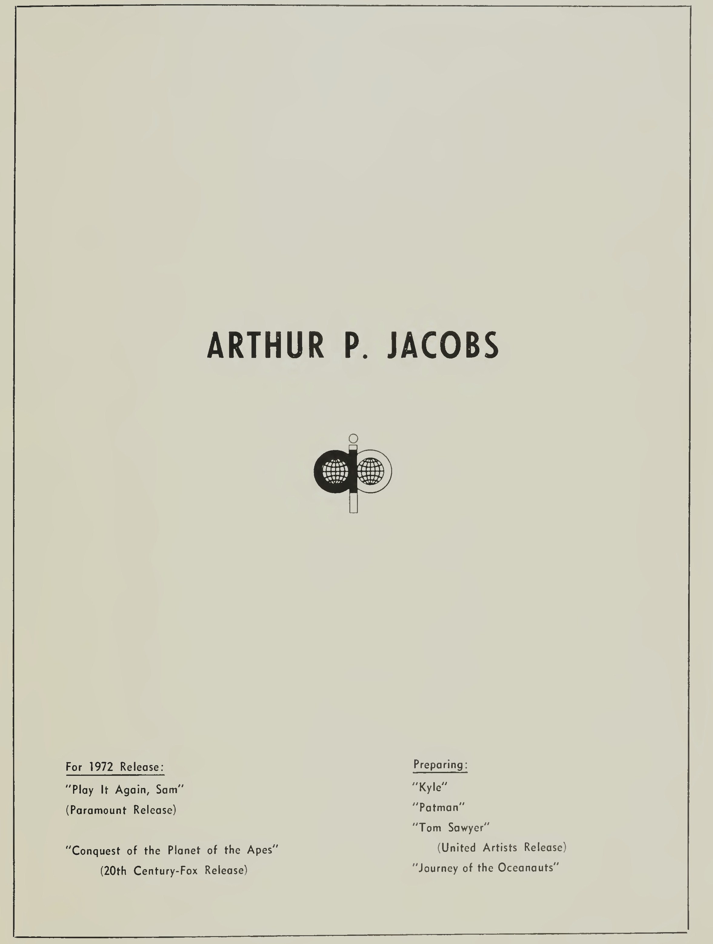 .html.html From: William Burge Sent: Friday, June 22, 2012 1:43 PM Subject: arthur p. jacobs canada film ads dear group, I found some canada film ads on arthur p. jacobs movies he produced thur his carrer . from william <.html <.html