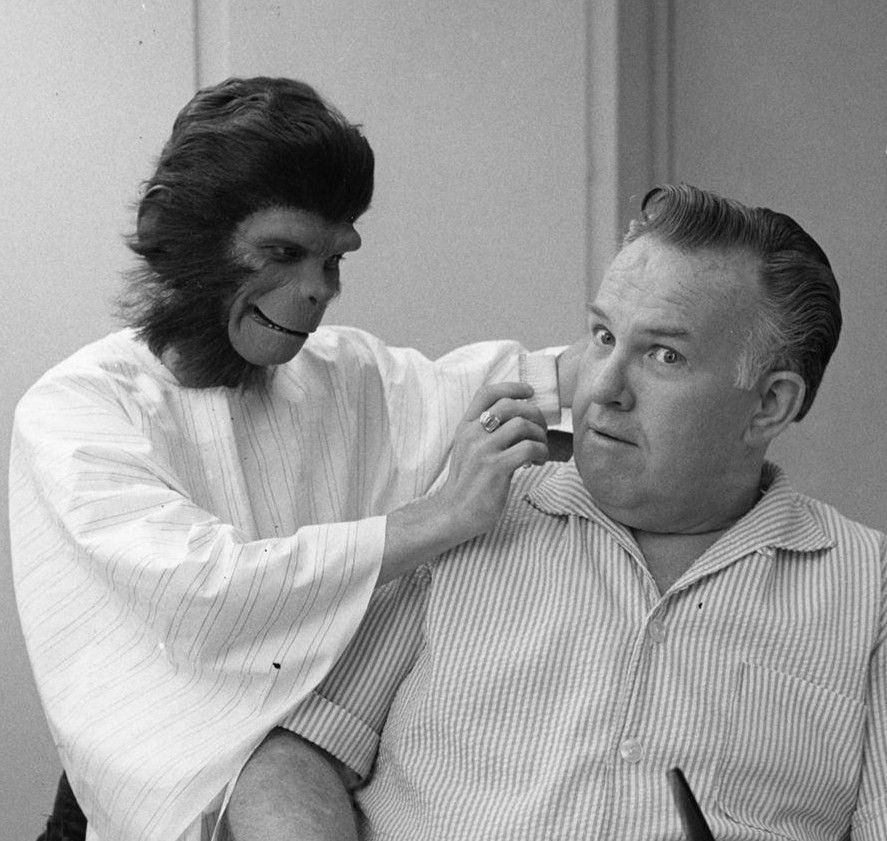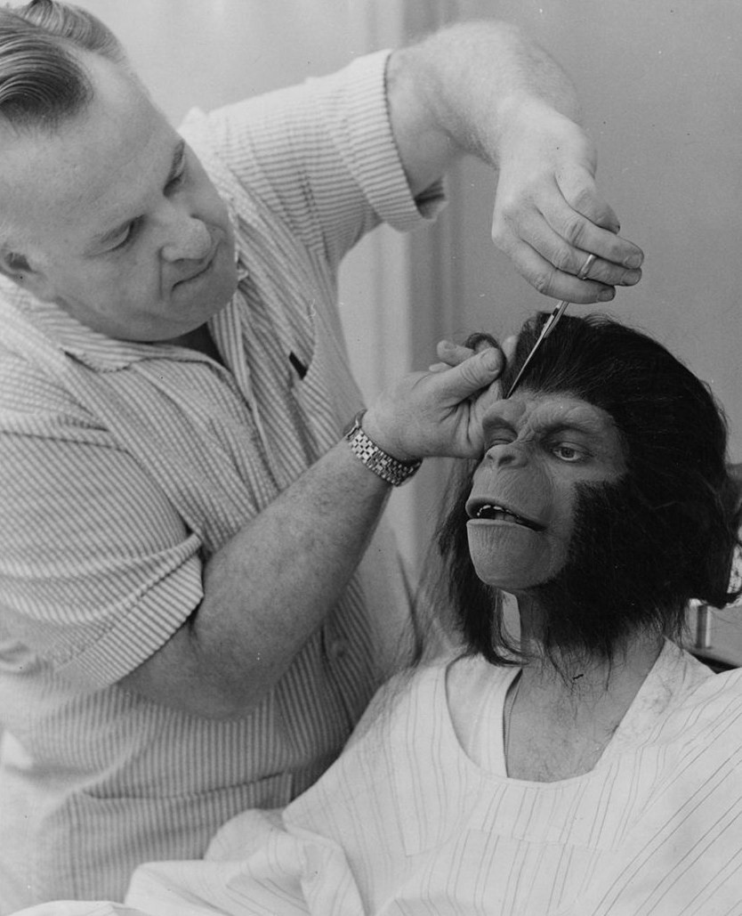 dear group, here are some rare photos of john chambers putting makeup on lou wagner and the other photos show makeup from the test film in march of 1966 and edward g robinson as dr zaius and charlton heston as thomas and james brolin as corneilius and linda harrison as zira. because of a heart condition edward g had to decline the part of zaius and the producers replaced him with maurice evans. enjoy from william <.html <.html