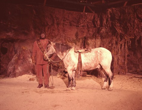 .html That scene is in the picture and it's not Cornelius riding him. It's when Aldo declares martial law and the humans are rounded up. The gorillas grab Landis and he goes, "Hey! Hey!". Landis has other shots in the movie. Not a very thorough book.